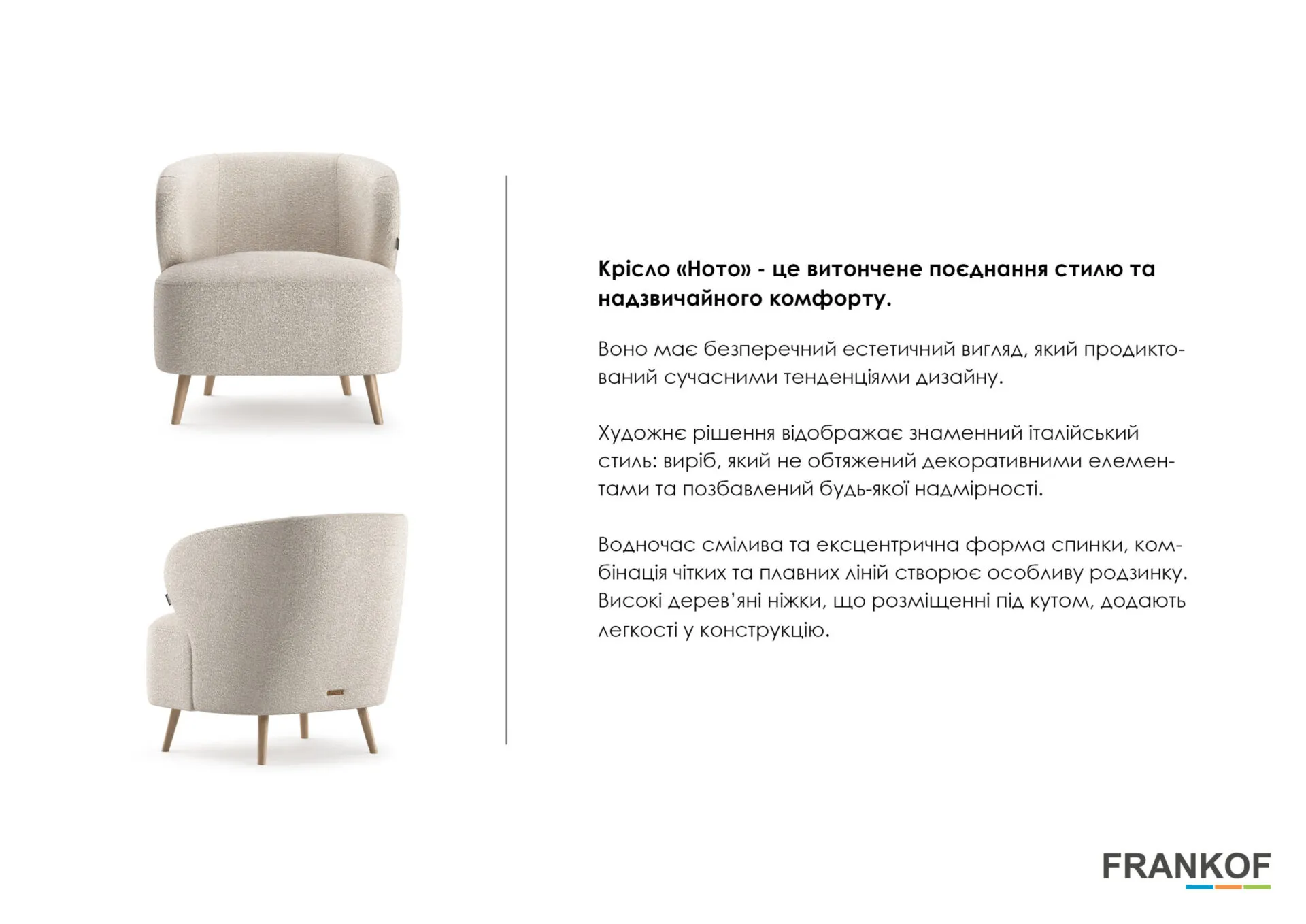 Крісло “Ното” – це витончене поєднання стилю та надзвичайного комфорту. Воно має безперечний естетичний вигляд, який продиктований сучасними тенденціями дизайну.
