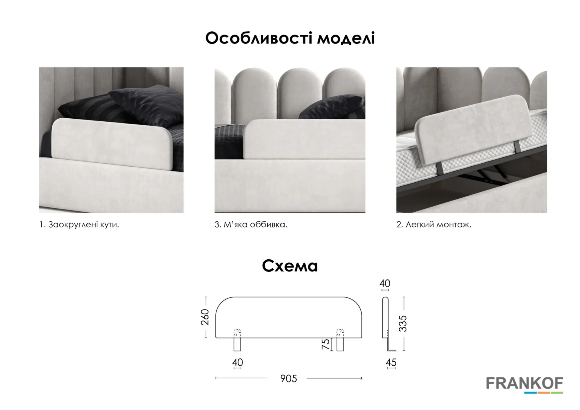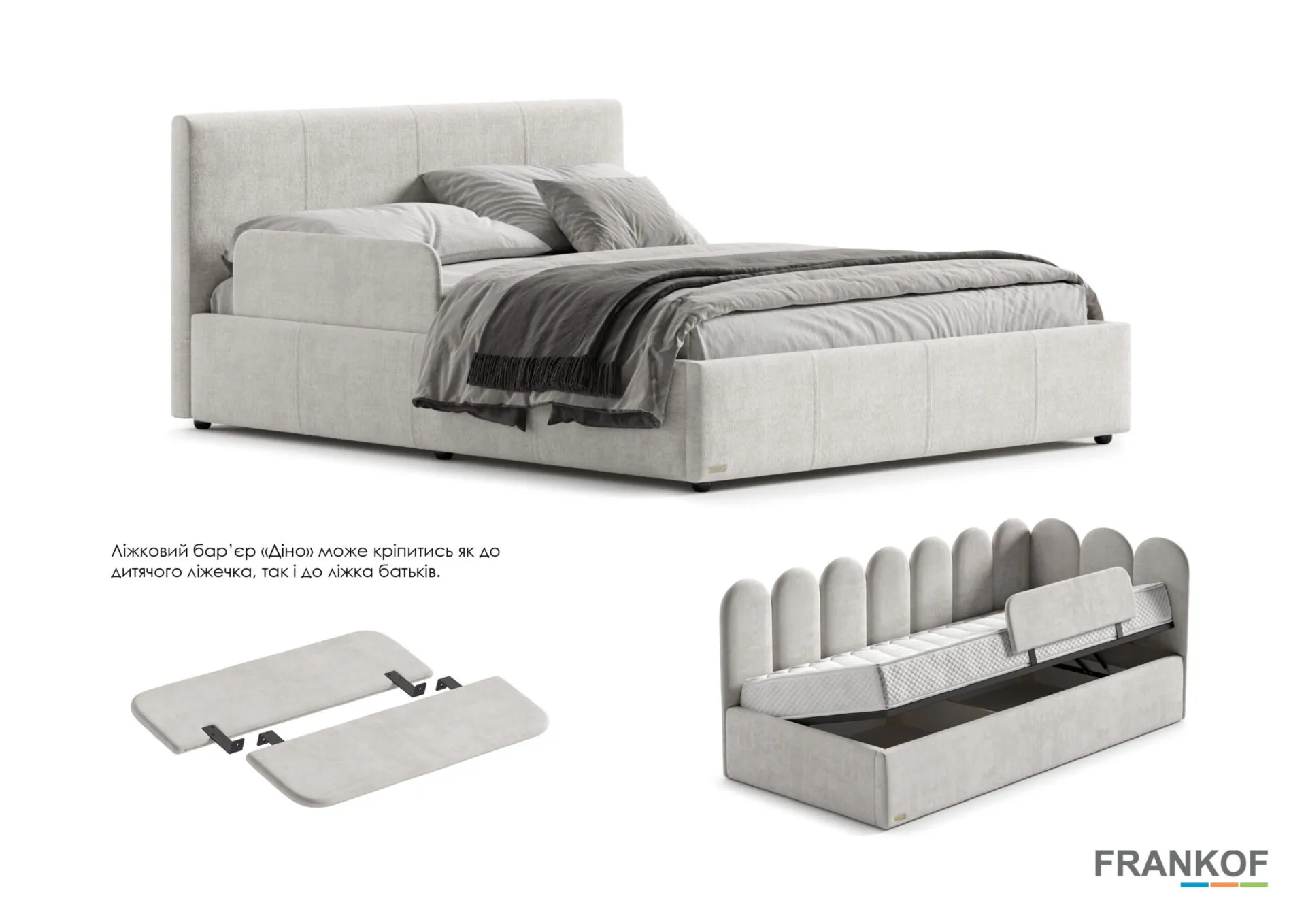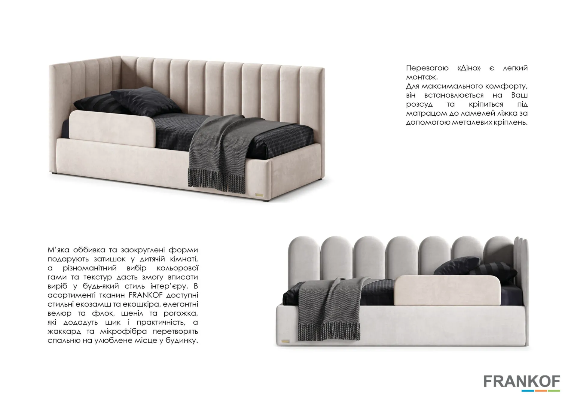 Захисний бар’єр до дитячих ліжечок “Діно” від фабрики м’яких меблів FRANKOF подарує не лише красу, але й безпеку. Він збереже дитину від раптового падіння та гарантує здоровий та міцний сон. Фабрика м’яких меблів FRANKOF подбала про те, щоб ліжковий бар’єр був розрахований навіть на активні ігри, які часто полюбляють малюки. Попри це, він не перевантажує простір кімнати.