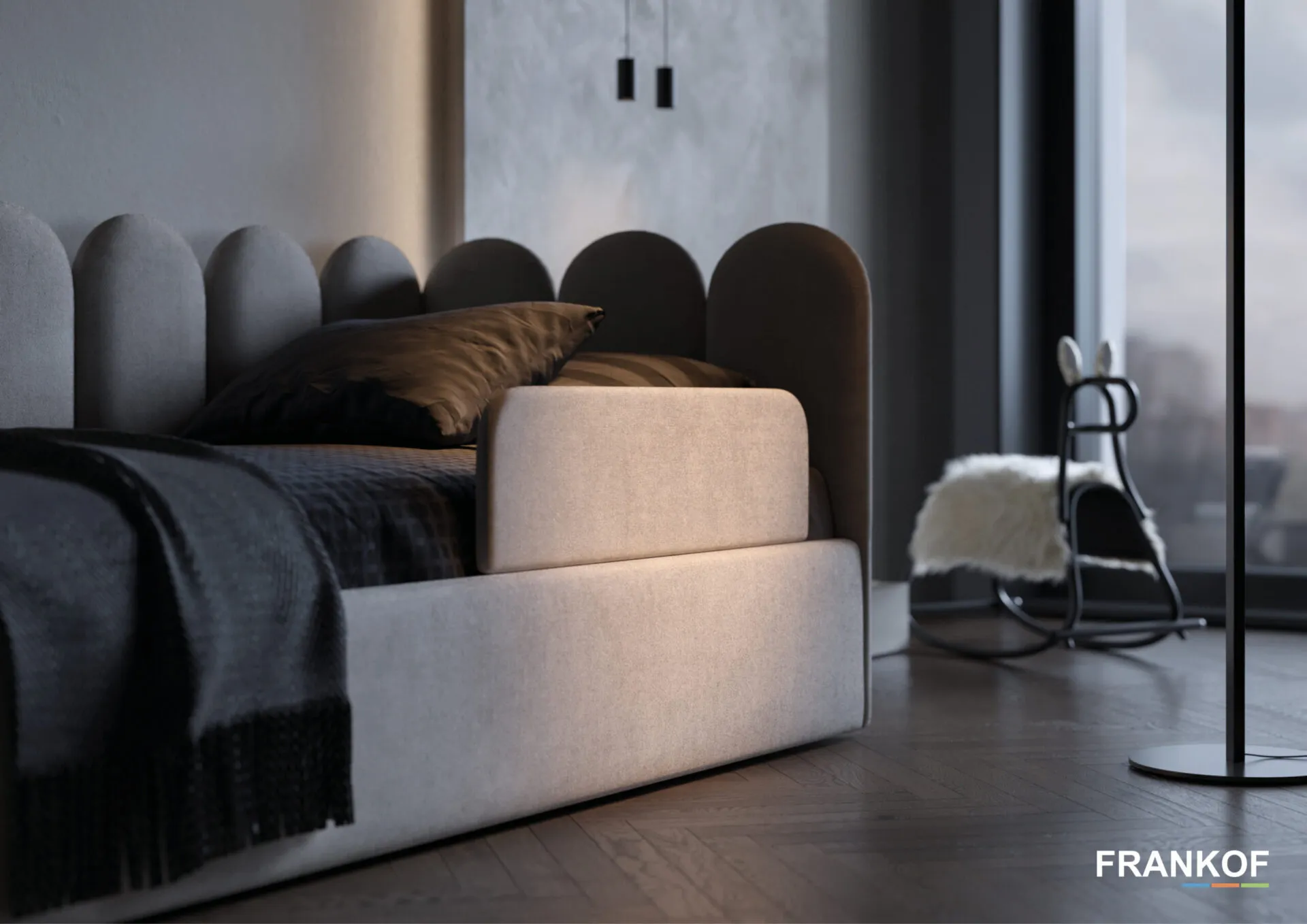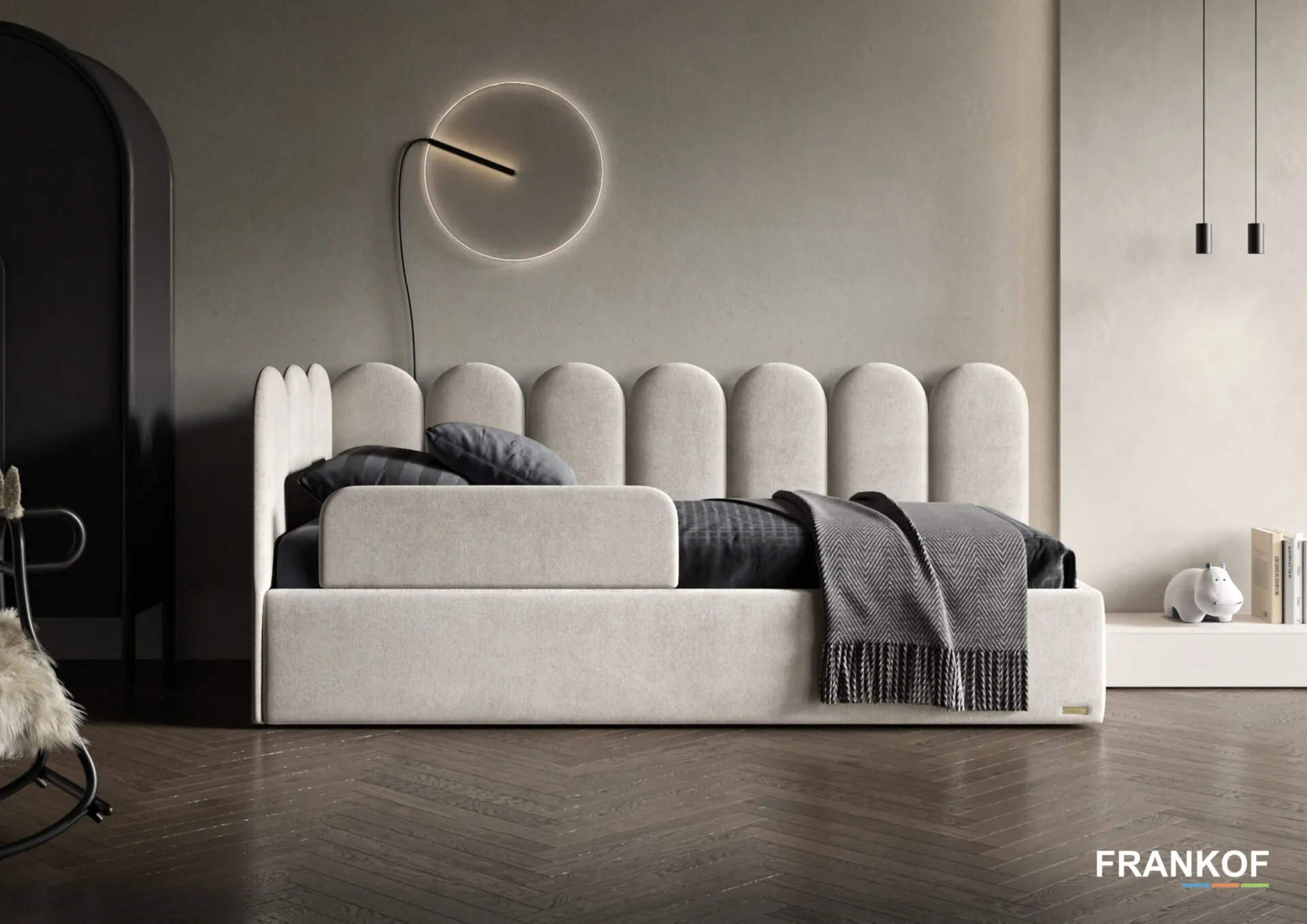 М’яка оббивка та заокруглені форми подарують затишок у дитячій кімнаті, а різноманітний вибір кольорової гами та текстур дасть змогу вписати виріб у будь-який стиль інтер’єру. В асортименті тканин FRANKOF доступні стильні екозамш та екошкіра, елегантні велюр та флок, шеніл та рогожка, які додадуть шик і практичність, а жаккард та мікрофібра перетворять спальню на улюблене місце у будинку.