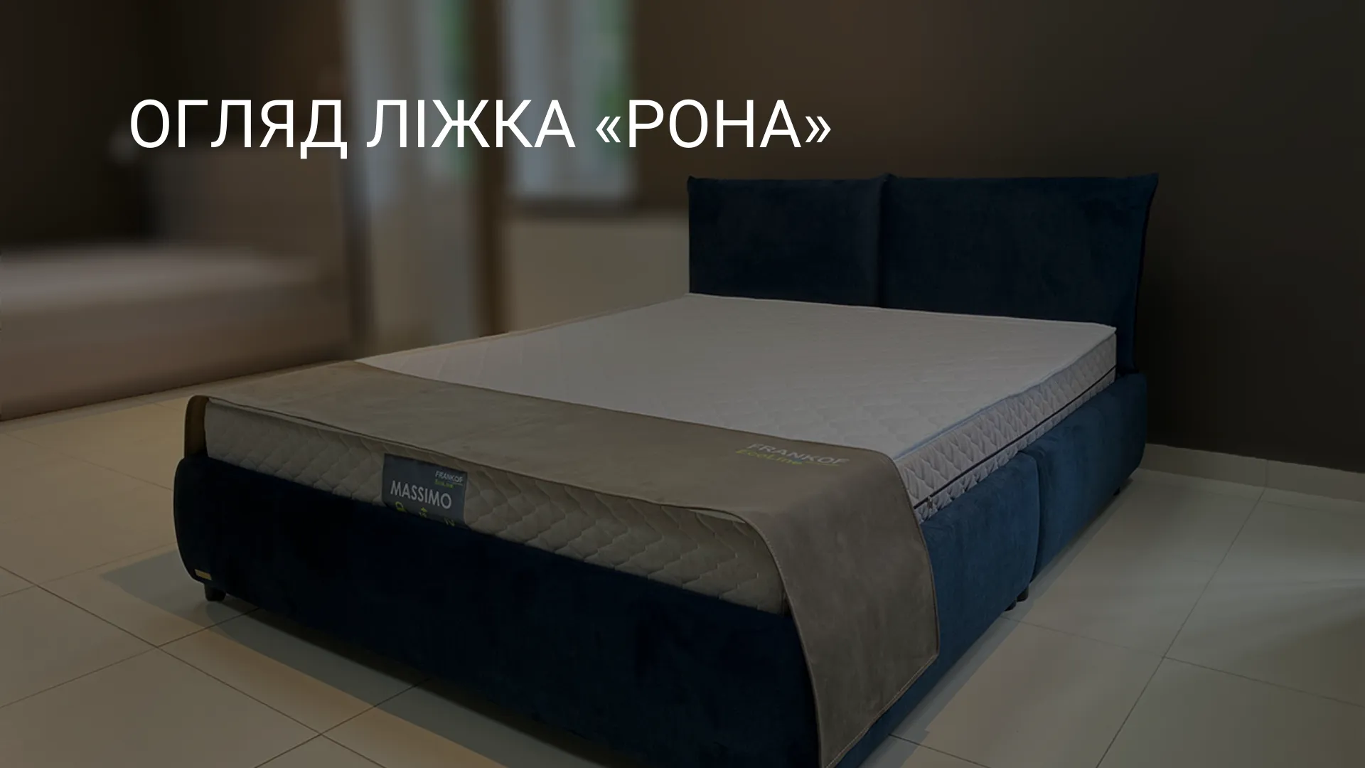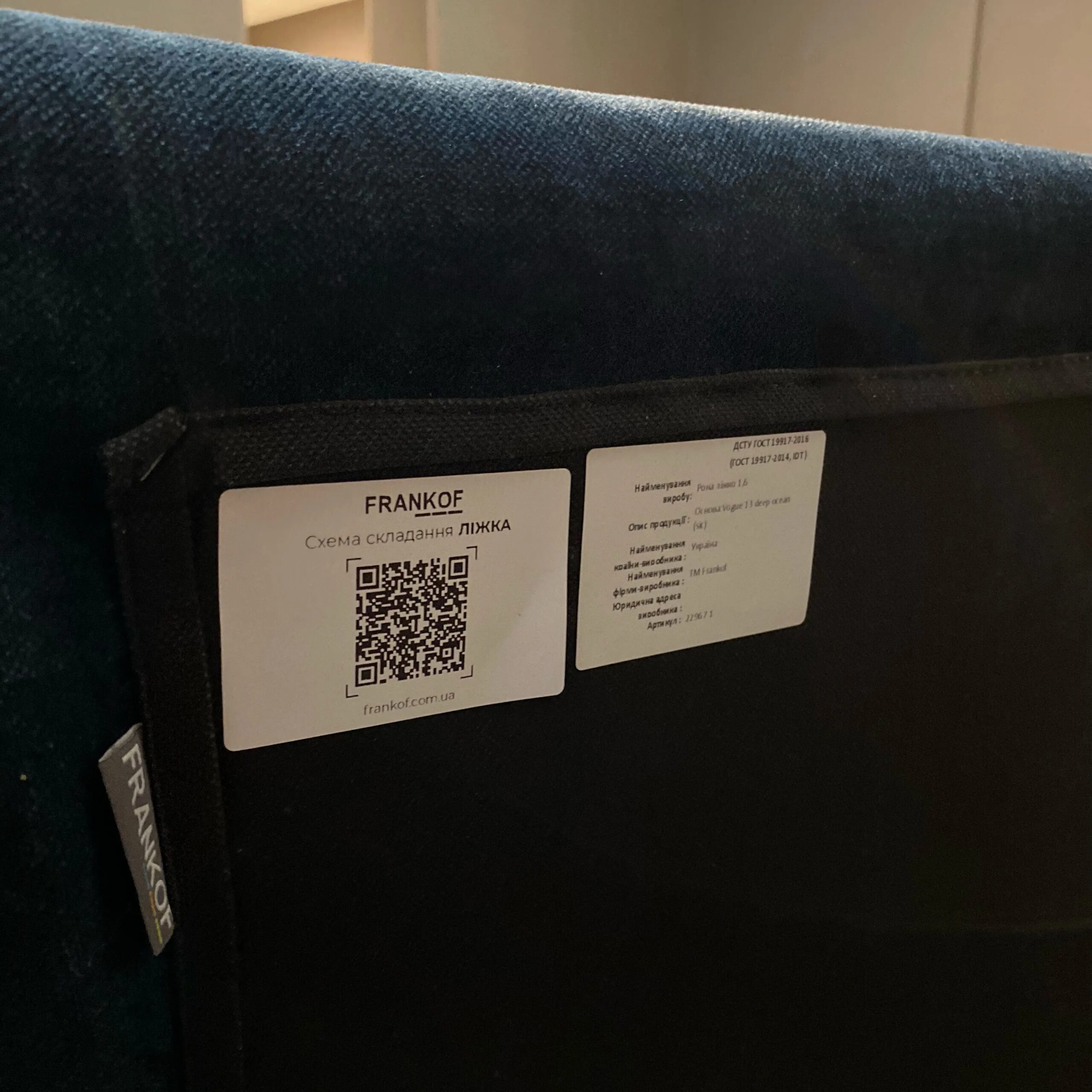 Ви можете вибрати будь-який колір та текстуру оббивки, розмір спального місця (від 0,9 до 1,8х2,0м). На фото, загальний габарит — 1,74х2,20м (спальне місце — 1,6х2,0м). На спинці у формі двох прямокутних подушок наклеються 2 наліпки із QR-кодом схеми складання та основною інформацією про ліжко. ЇЇ спинки — 0,97м.