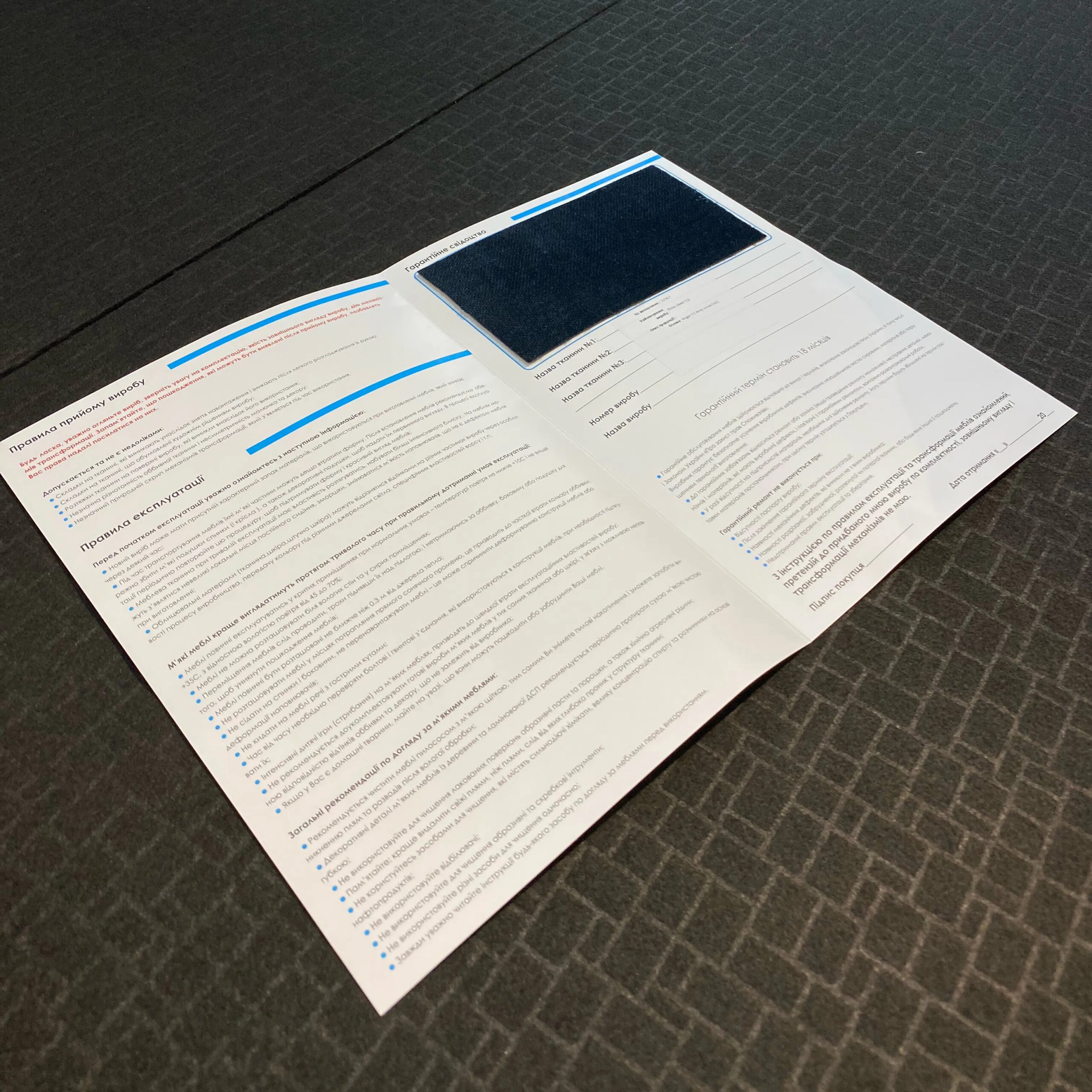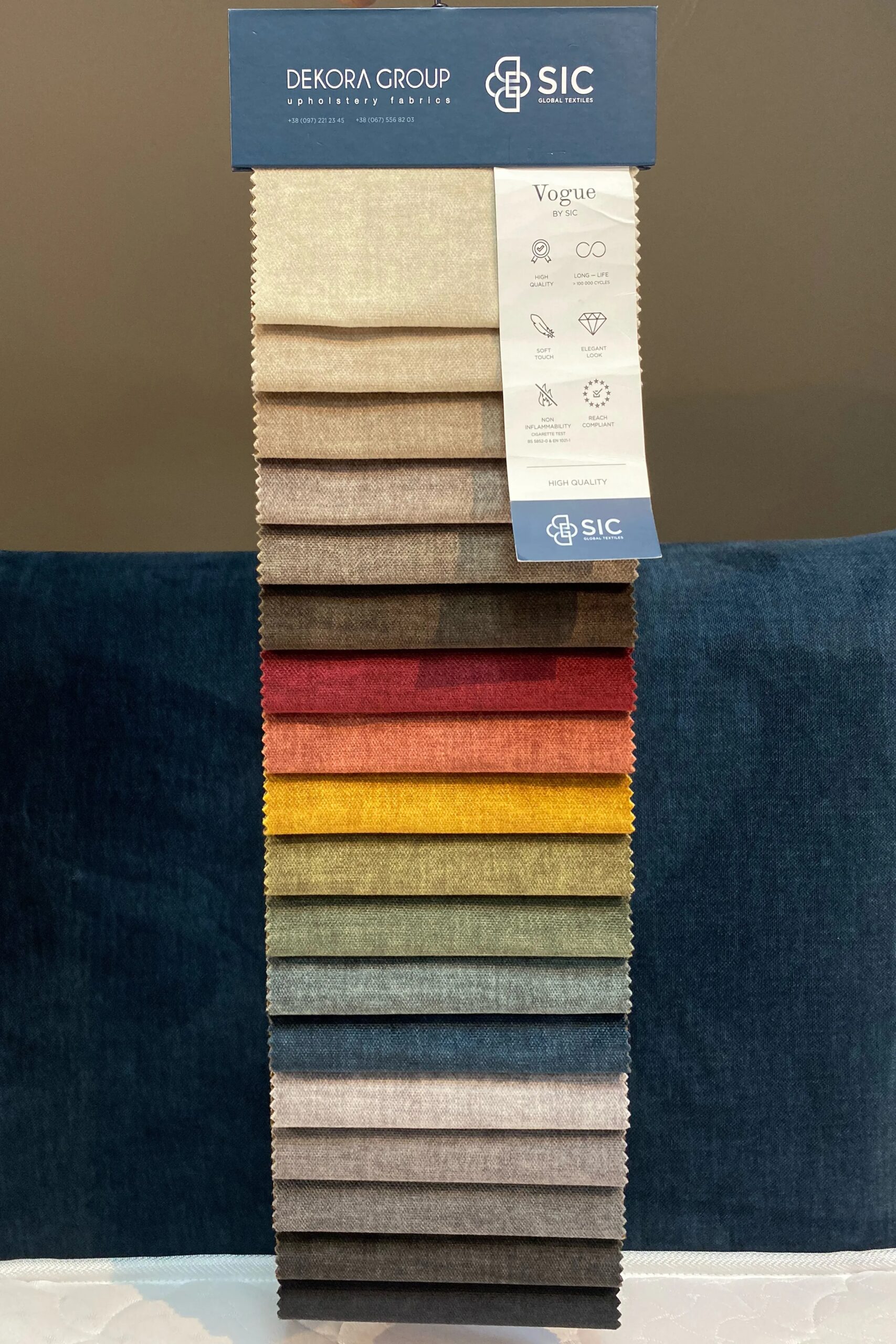 Асортимент понад 1000 тканин дасть змогу урізноманітнити його лаконічний дизайн. Розкішне чи ніжне, витончене чи зухвале —вирішувати Вам! У цьому виробі використаний текстиль «13 deep ocean» із колекції «Vogue» від польського виробника «SIC». Матеріал відрізняється приємною м’якістю, високою зносостійкістю, забезпечує захист від тварин та рідин, підходить для домашньої та комерційної експлуатації. Стійкість до стирання — 105 000 циклів Мартиндейла, щільність — 370 г/м², склад — 100 % поліестер. Тканина не потребує ретельного щоденного догляду, проте рекомендується уникати потрапляння прямих сонячних променів, розташовувати не ближче 30–40 см від джерел тепла, не відбілювати, не використовувати сильні чистячі абразивні речовини, не застосовувати розчинники на основі нафтопродуктів, не прасувати.