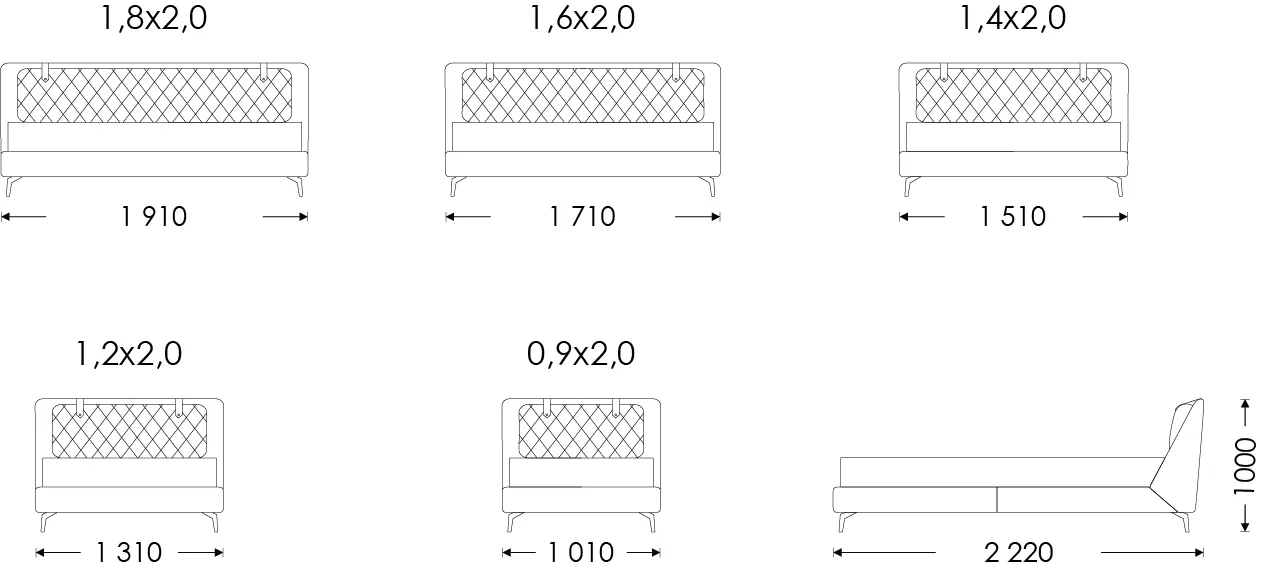 На фото загальні розміри ліжка 1,71*2,21 м (спальне місце 1,6х2,0 м). Проте, може виготовлятися в розмірах під матрац від 0,9 — 1,8х2,0 м. Товщина царг — 4 см, узголів’я — 15 см, а висота спинки — 100 см.