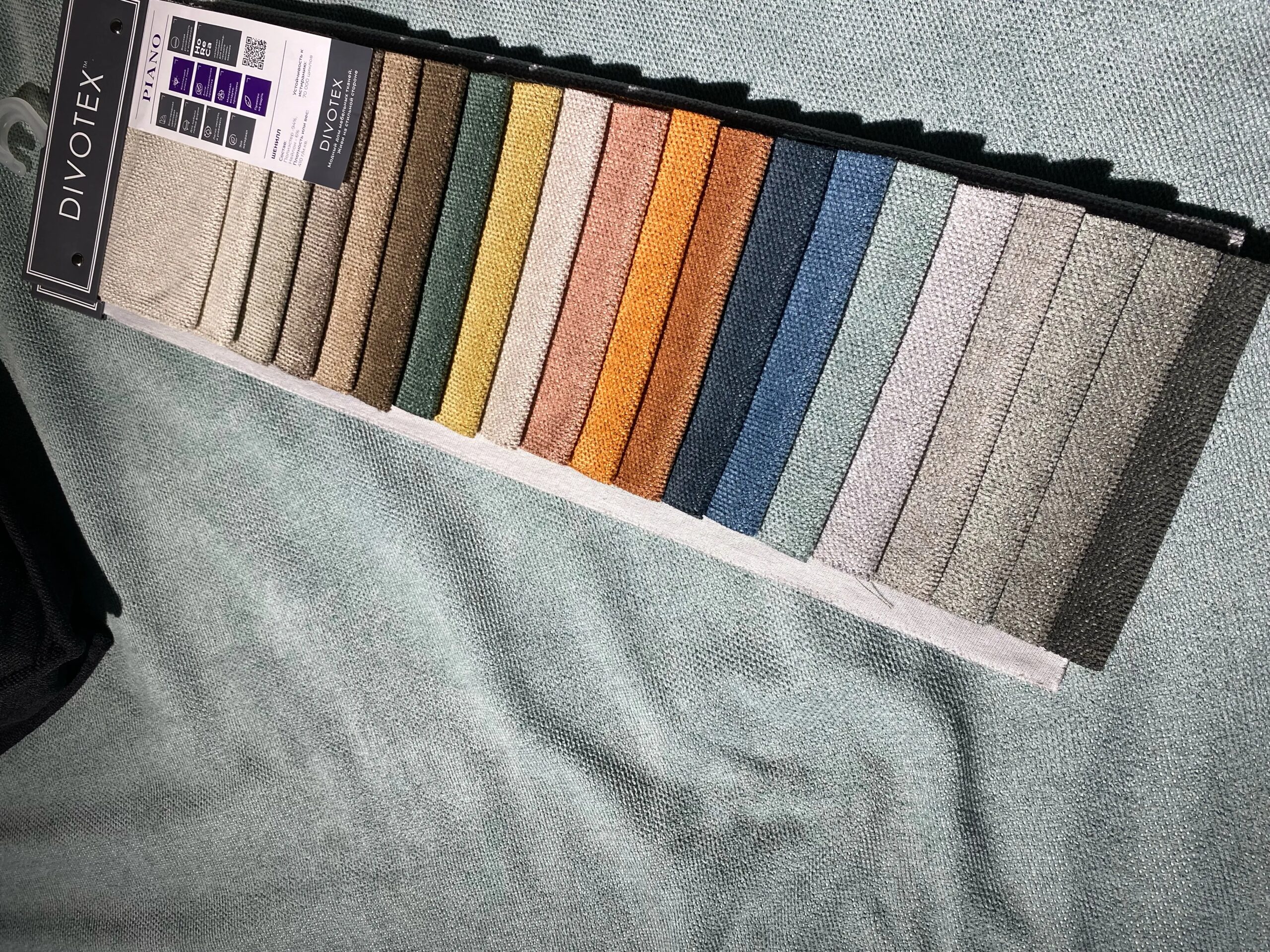 Для оббивки «Белфасту» пропонується палітра 1000 різних видів тканин. Зокрема, на фото використана колекція шенілу «Piano» від Divotex. Це щільний та м’який тексиль із чудовим дизайном та високою якістю. Фактура Soft Toch забезпечує ніжну поверхню та брудовідштовхуючі властивості. Варто відзначити, що ця тканина володіє хорошими показниками зносостійкості (70 000 циклів!), завдяки яким вона прослужить довгий час. Її можна використання як вдома, так і в закладах HoReCa. Виробництво — Туреччина.