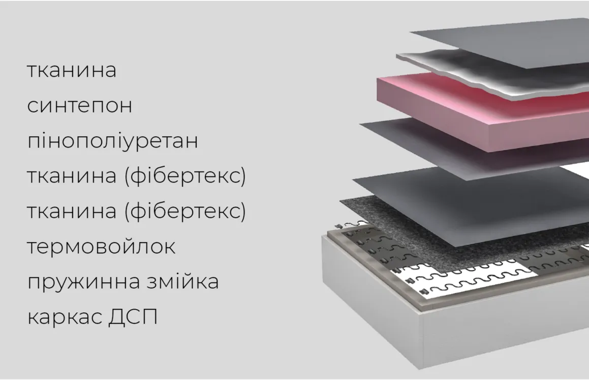 В основі модульного дивану цільний брук хвойних порід низької вологості, ДСП, пружинна змійка та ППУ різних ступенів щільності. Максимальне навантаження на 1 сидіння — 130 кг. Ступінь жорткості — ІІ.