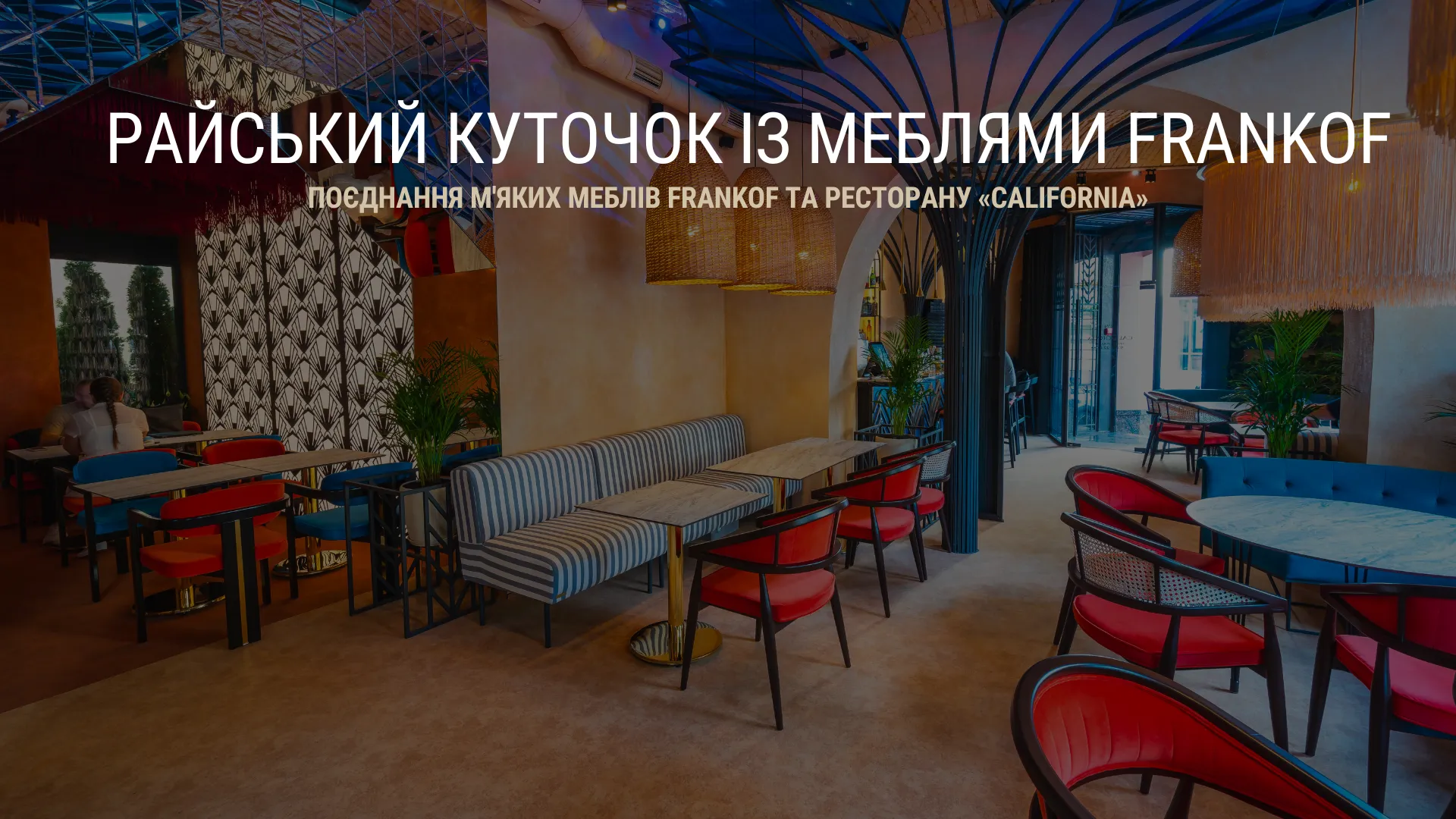 Незвичне поєднання кольорів та фактур текстилю FRANKOF дозволяє урізноманітнити свій відпочинок — не тільки смачно поїсти, а й насолоджуватися естетикою та затишністю. Смугасті прямі форми контрастують із заокругленими меблями блакитного кольору, нагадуючи неземну красу дюн пустелей та мальовничих лагун Каліфорнійської затоки.